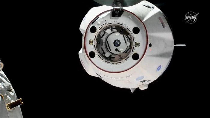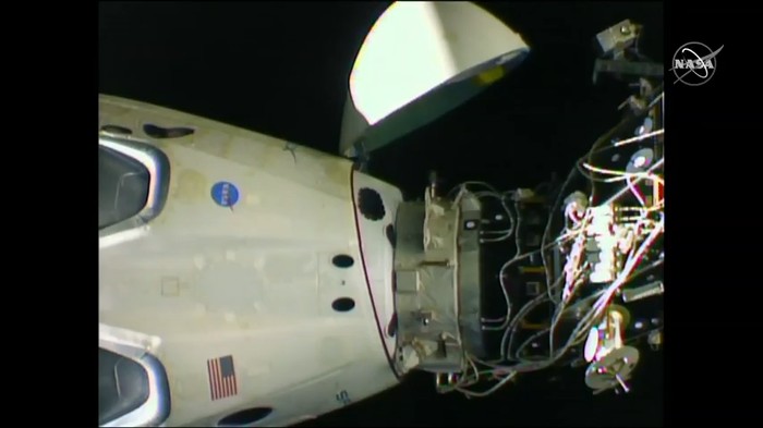 Crew Dragon pertama-tama melepaskan diri dari ISS. Selama di ISS, Crew Dragon merapat di International Docking Adaptor yang berada di luar modul Harmony. Foto: NASA TV