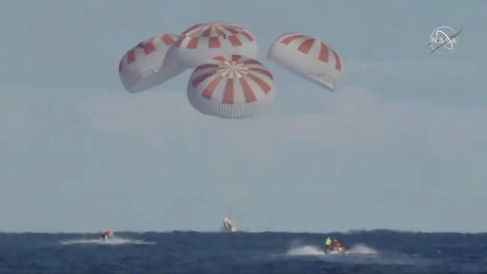 Pada pagi hari sekitar pukul 8.45 waktu Amerika Serikat bagian Timur, Crew Dragon, dibantu dengan empat parasut, berhasil mendarat dengan mulus di Samudera Atlantik dekat Florida, AS. Foto: Reuters