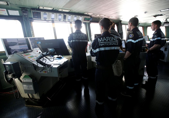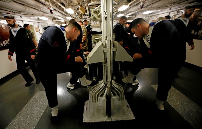 Para pelaut memeriksa sepatu masing-masing di dalam kapal induk Charles de Gaulle. Foto: Reuters