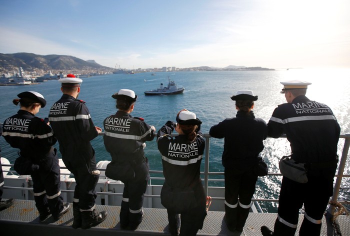 Awak kapal Charles de Gaulle menatap pelabuhan Toulon saat meninggalkan Prancis. Foto: Reuters
