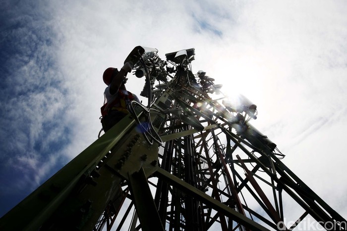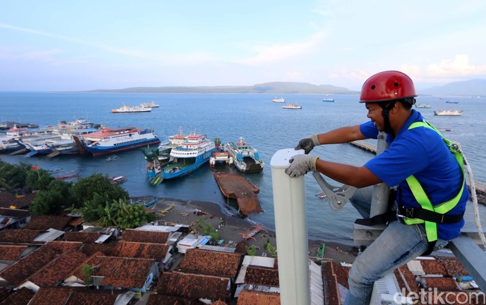 Teknisi XL Axiata melakukan pemeliharaan perangkat BTS di kawasan Pelabuhan Feri Penyeberangan Ketapang, Banyuwangi, Jawa Timur, Kamis (14/3/2019).