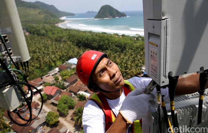 Teknisi XL Axiata melakukan pemeliharaan perangkat BTS di kawasan Pantai Pulau Merah, Banyuwangi, Jawa Timur, Kamis (14/3/2019).
