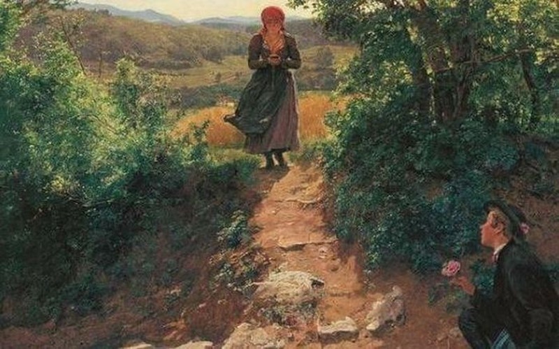 Sebuah lukisan yang berasal dari tahun 1850 menjadi viral. Pasalnya, lukisan tersebut menggambarkan seorang wanita sedang tertunduk asyik menggenggam benda mirip ponsel, sementara di sisi lain ada seorang laki-laki yang menunggunya lewat untuk memberinya bunga. Tentu jadi hal aneh, mengingat di tahun tersebut belum ada smartphone. Foto: Internet