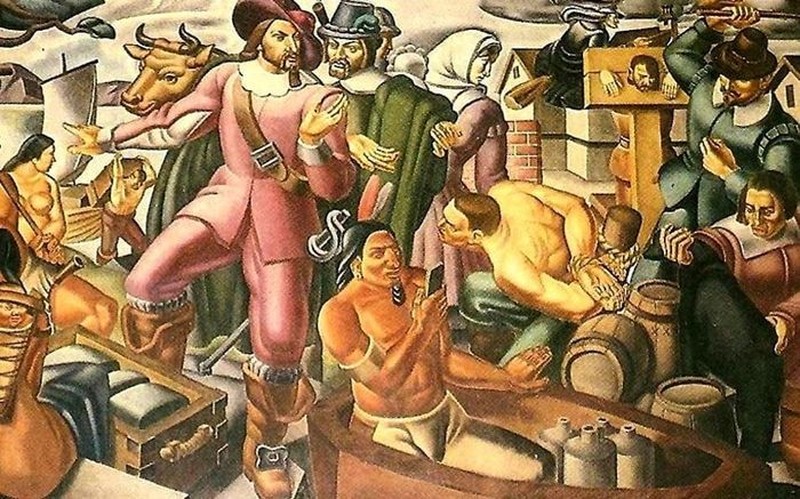 Lagi-lagi, sebuah gambar jadul memperlihatkan kemunculan ponsel. Dalam karya mural dari tahun 1937 berjudul 'Mr. Pynchon and the Settling of Springfield' ini, sang pelukis Umberto Romano menggambarkan aktivitas di masa-masa sebelum Perang Revolusi di antara kalangan suku New England dan penduduk asli Inggris. Foto: Internet