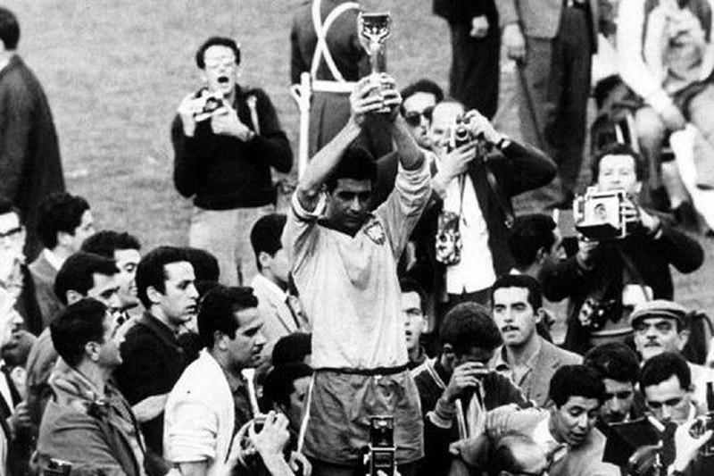 Pada perayaan kemenangan Piala Dunia 1962 yang disabet timnas Brasil, ada yang cukup aneh. Tampak di posisi bawah depan, kelihatannya seseorang memakai ponsel lipat untuk mengabadikan momen tersebut. Apakah dia penjelajah waktu? Foto: istimewa