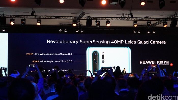 Sedangkan P30 Pro, mengusung layar berukuran 6,47 inch dengan resolusi 2340 x 1080 pixel. Quad camera Huawei P30 Pro punya resolusi 20 MP + 40 MP + 8 MP, sedangkan kamera depannya 32 MP. Kemampuan kamera di P30 Pro ini amat dibanggakan Huawei. Foto: Rachmatunnisa/detikINET