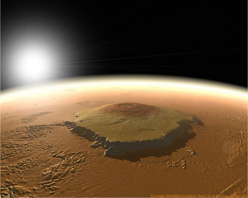 Olympus Mons: Olympus Mons adalah gunung berapi yang disebut paling ekstrim di Tata Surya, dengan luas sebesar negara bagian Arizona. Tingginya 25 kilometer atau sekitar 3 kali lipat gunung Everest. Gunung ini diperkirakan cukup mudah didaki. Foto: NASA