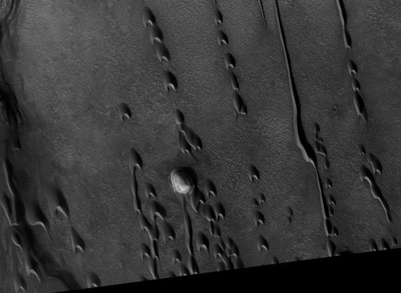 Bukit Pasir Hantu: Bukit pasir hantu ini disebut sebagai bukti air di Mars yang eksis di masa silam. Ilmuwan mengatakan bahwa di masa silam, wilayah di Noctis Labyrinthus dan cekungan Hellas memilki bukit pasir setinggi belasan meter. Bukit itu lantas dibanjiri lava atau air melestarikan kontur bukit pasir tersebut. Foto: NASA