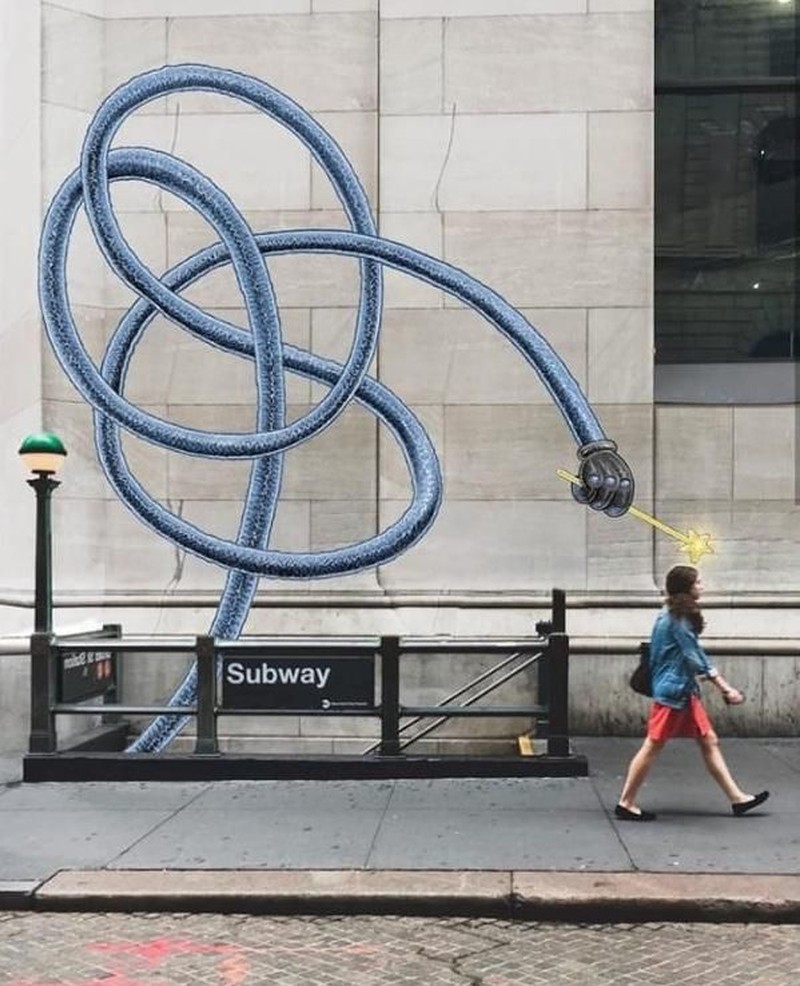 Ben membuat gambar doodlenya seoalah saling berinteraksi dengan manusia sungguhan dengan cara yang lucu dan juga nakal. (Foto: Instagram/subwaydoodle)