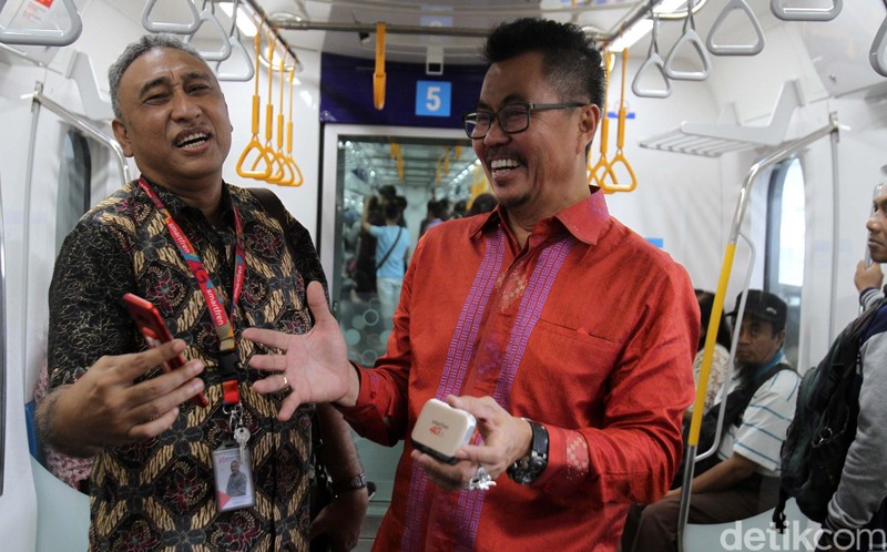 Deputy CEO Smartfren Djoko Tata Ibrahim dan VP Technology Relations and Special Project Smartfren Munir Syahda Prabowo saat mencoba sinyal Smartfren didalam MRT Jakarta, Selasa (9/4/2019).