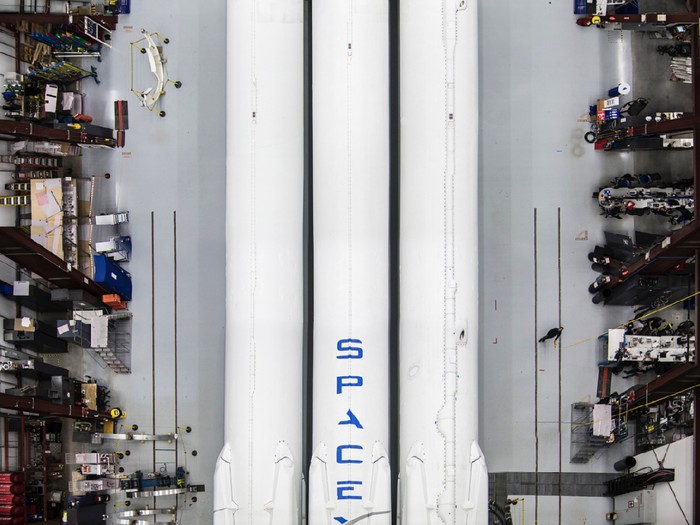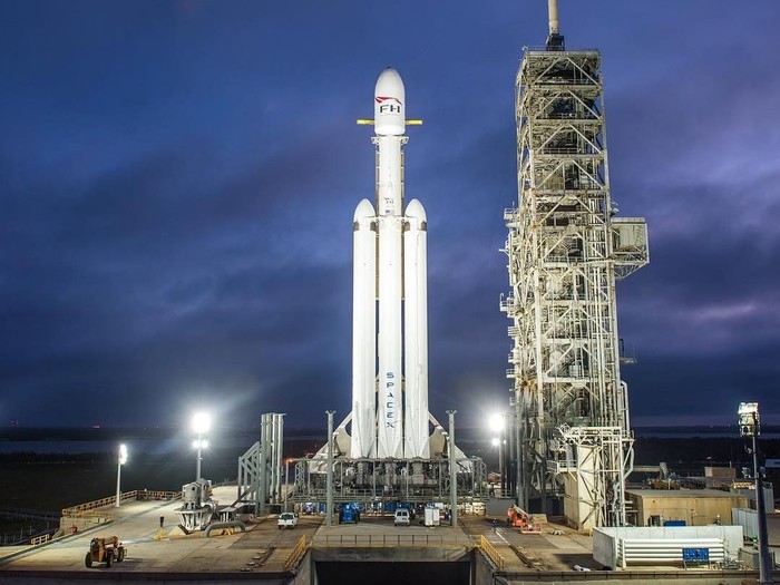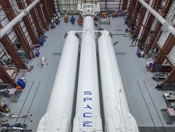 Falcon Heavy dipersiapkan untuk mengangkut satelit ke orbit dan nantinya juga melakukan misi dengan awak menuju Bulan dan Mars.Β Foto: Dok. Instagram Elon Musk