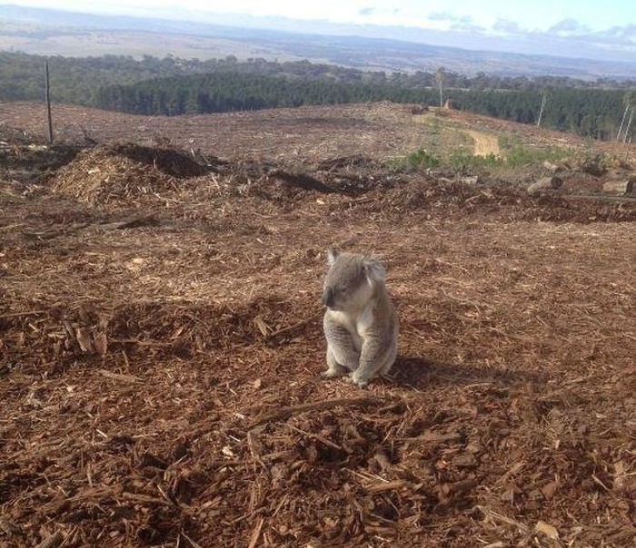 Koala kecil ini terlihat bingung dan sedih ketika rumahnya sudah rata dengan tanah. Dijelaskannya koala ini duduk di atas tumpukan kayu selama lebih dari satu jam. (Foto: Brightside)