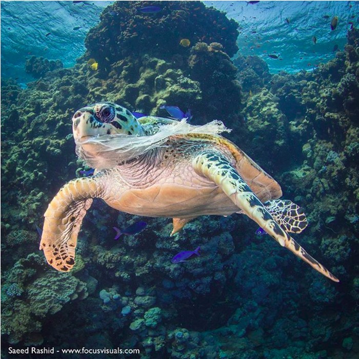 Miris! tubuh penyu ini terjebak oleh ikatan plastik sehingga membuat tubuhnya turut terluka. (Foto: Brightside)