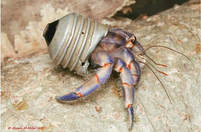 Kepiting pertapa yang mencoba beradaptasi dengan limbah sampah. Ia menggunakan bekasΒ bohlam lampu sebagai "rumah" barunya.Β (Foto: Brightside)