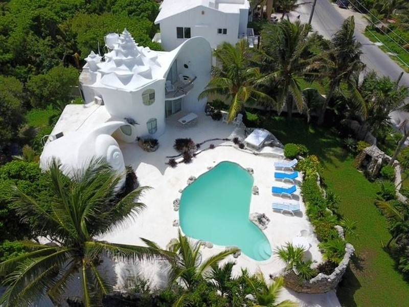 Rumah kerang di Casa Caracol, Isla Mujeres, Meksiko ini disewakan untuk turis menginap. Ada dua ruang tidur dan kolam renang pribadi yang dikelilingi pohon kelapa. Foto: via Trend Chaser
