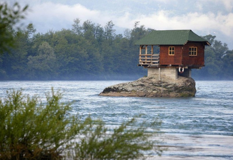 The Drina River House, di Bajina Basta, Serbia punya sejarahnya sendiri. Pada 1968, ada sekelompok pemuda menikmati berjemur di atas batu di tengah sungai. Batu itu kemudian dijadikan fondasi untuk tempat berteduh yang akhirnya dibangun rumah kecil yang masih ada hingga sekarang. Drina River House juga jadi salah satu kandidat bangunan yang dilindungi UNESCO. Foto: via Trend Chaser