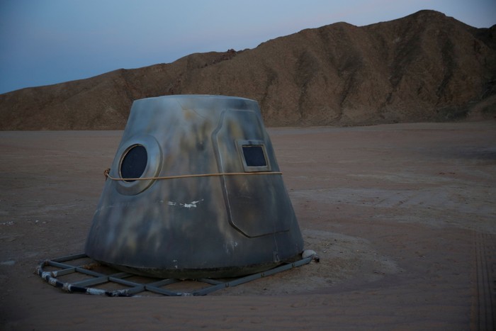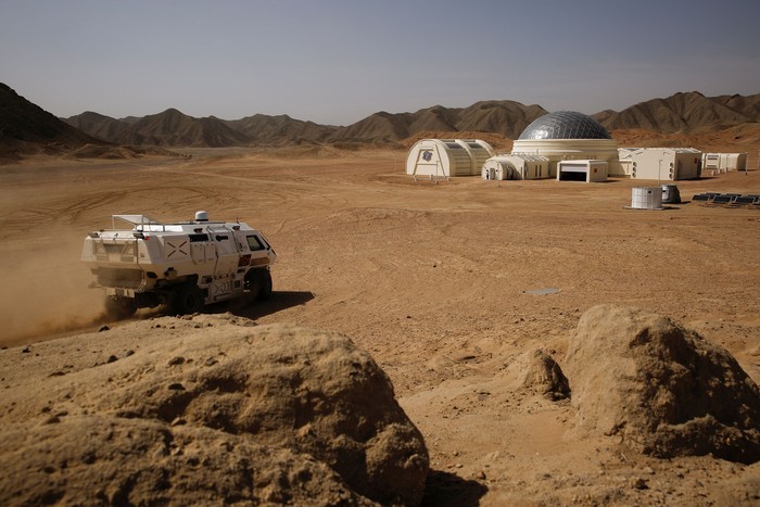 Markas simulasi yang dinamai C-Space Project Mars ini dibentuk sedemikian mungkin sehingga menyerupai koloni di Planet Merah. Itu terbantu dengan lingkungan gurun yang kering, berpasir, dan kemerahan. Mirip-mirip dengan permukaan Mars. Thomas Peter/Reuters.