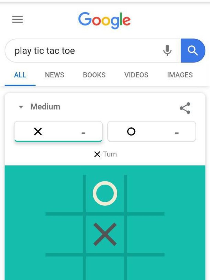 "Play tic tac toe" akan menghasilkan pencarian yang membuat dirimu dapat langsung bermain tic tac toe. (Foto: screenshot Google search)