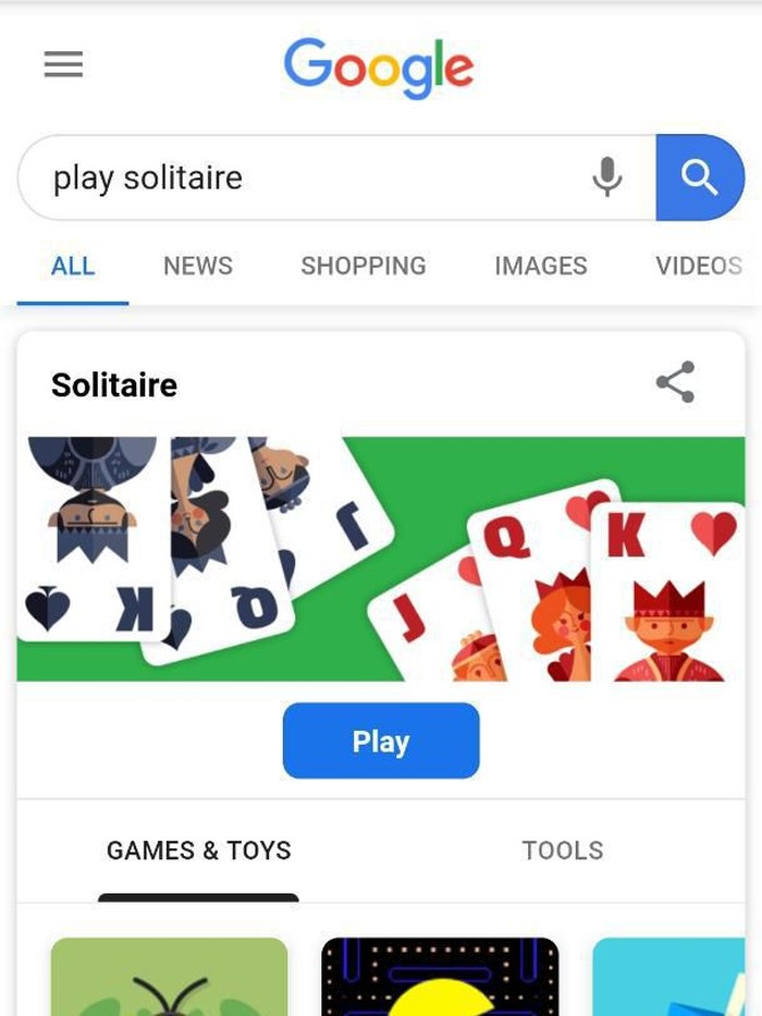 Satu lagi game yang bisa kamu mainkan lewat pencarian Google adalah dengan mengetik "Play solitaire". (Foto: screenshot Google search)
