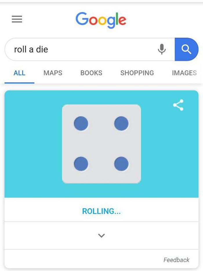 Ada pula "Roll a die" yang dapat kamu ketik sebagai alternatif dadu fisik. (Foto: screenshot Google search)