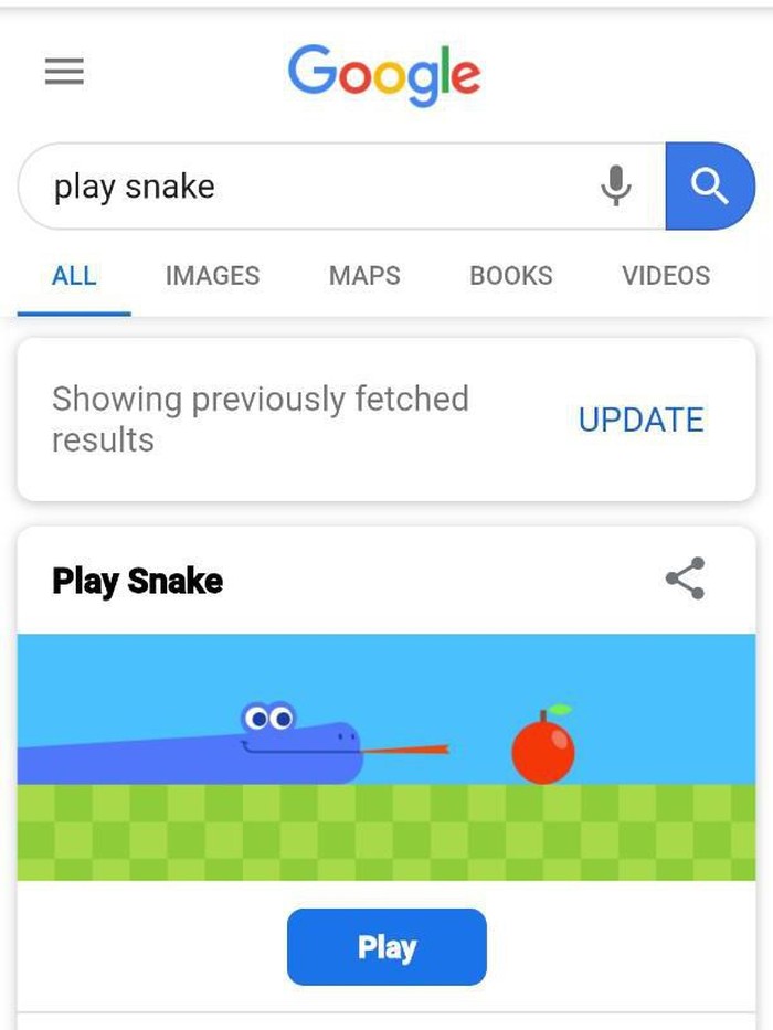 "Play snake" bakal membuatmu bisa bermain game legendaris itu di laman pencarian Google. (Foto: screenshot Google search)
