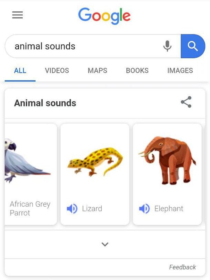 "Animal sounds" untuk memunculkan hasil pencarian berupa ikon hewanΒ sekaligusΒ suara-suara yang dihasilkannya. (Foto: screenshot Google search)