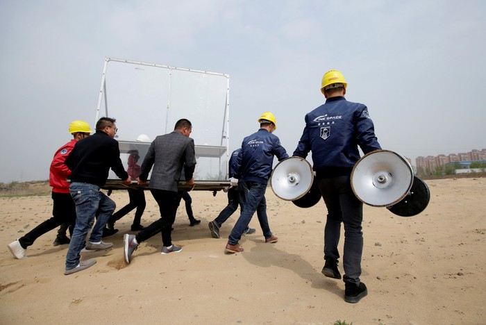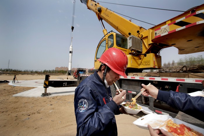 Istirahat sambil makan di sela-sela mendirikan satelit. China punya visi memiliki konstelasi satelit komersial dengan bergaam kegunaan, dari menyediakan internet kecepatan tinggi sampai untuk mengawasi pengapalan sumber daya alam. Foto: Reuters
