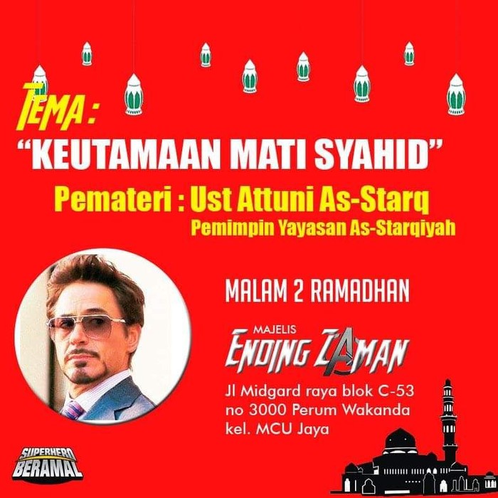 Tony Stark alias Iron Man menjadi pembicara dalam kajian dengan tema 'Keutamaan Mati Syahid'. Nama Tony Stark diplesetkan menjadi Ust. Attuni As-Starq. Foto: Istimewa
