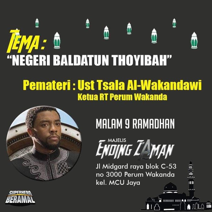 Meme kocak yang berisi ajakan 'Kajian Ramadhan' para Avengers itu menyebar luas di dunia maya dengan nama 'Majelis Ending Zaman. Lokasi penyelenggaraannya juga terpampang jelas di Jl. Midgard raya C-53 no 3000, Perum Wakanda kel. MCU Jaya. Foto: Istimewa