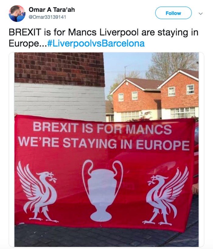 "Brexit adalah untuk Manchester, kami tetap berada di Eropa" tulis spanduk ini yang tentu menyindir Manchester United sang musuh bebuyutan. Foto: istimewa