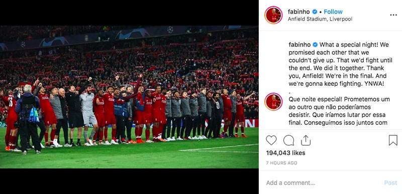 Fabinho memajang foto dengan adegan mirip seperti yang diposting Andy. “Betapa malam yang istimewa. Kami berjanji satu sama lain tidak pernah menyerah. Bahwa kami akan bertarung sampai akhir,” tulis dia. Foto: Instagram