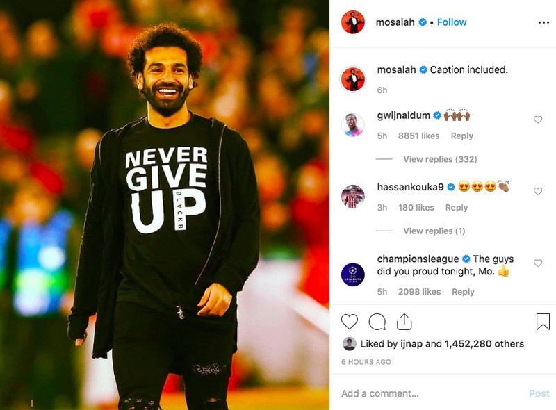 Mo Salah yang tidak bermain karena cedera memajang foto ini di Instagram. Tampak dia tersenyum lebar memakai kaos Never Give Up yang benar-benar dilakukan Liverpool. Foto: Instagram