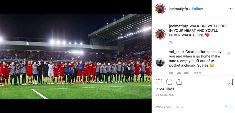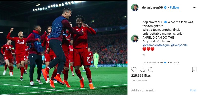 “Apa-apaan ini? Momen tak terlupakan, hanya Anfield yang bisa melakukan ini,” tulis Dejan Lovren. Foto: Instagram