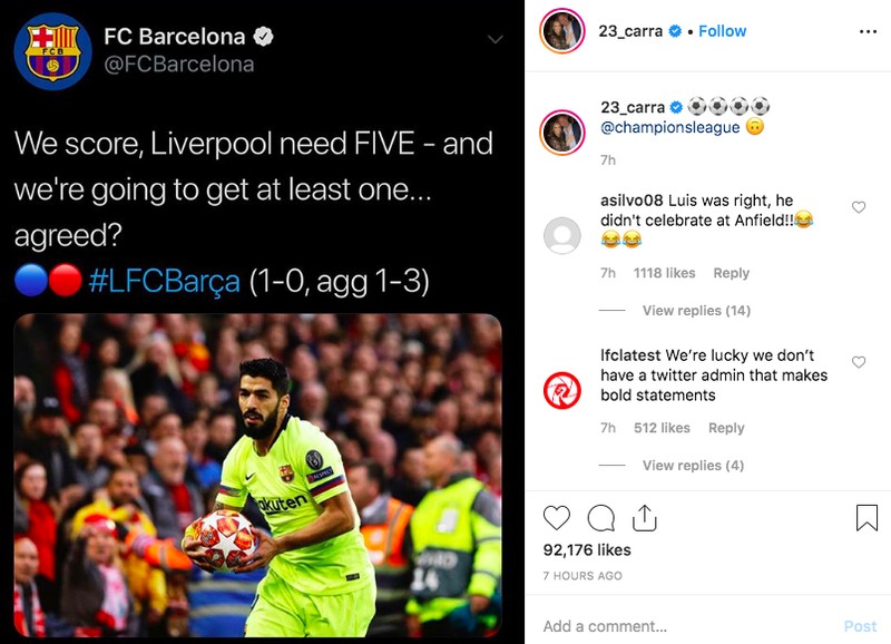 Jamie Carragher dengan usil mengambil kalimat sesumbar Barcelona bahwa Liverpool hampir tak mungkin menang karena sudah tertinggal 0-3. Carrager dalam caption menulis gambar 4 bola, sesuai skor Liverpool lawan Barcelona, 4-0. Foto: Instagram