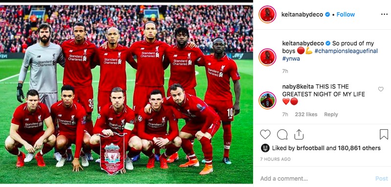 “Sungguh bangga dengan rekan-rekanku,” tulis Keita yang tidak bermain karena cedera. Foto: Instagram