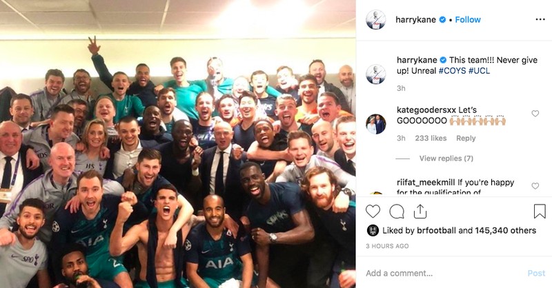 Harry Kane yang tak bermain pun larut dalam kegembiraan. “Tim ini. Tidak pernah menyerah,” Foto: istimewa