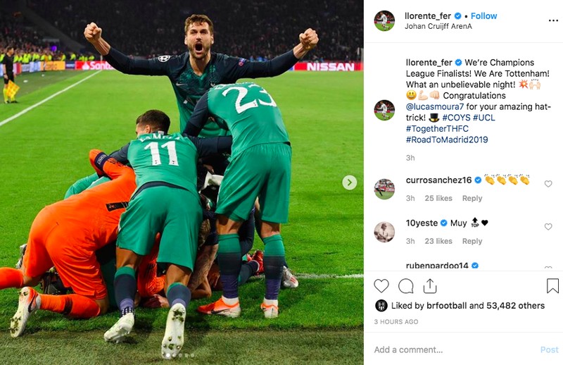 Fernando Llorente bersorak. “Kami adalah finalis Liga Champions. Kami Tottenham. Malam yang syukar dipercaya,” Foto: istimewa