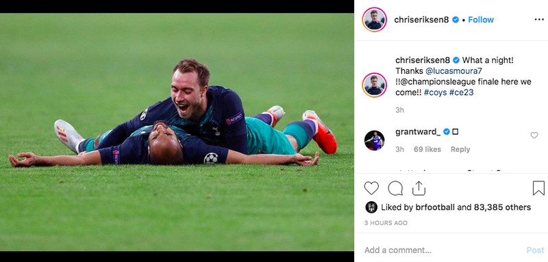 Christian Eriksen mengucap rasa terima kasihnya pada Moura yang mencetak tiga gol. Foto: istimewa