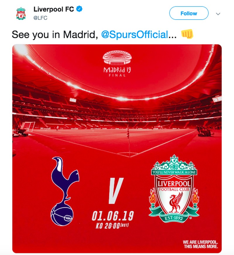 Liverpool di Twitter langsung memberi ucapan tantangan. "Sampai jumpa di Madrid, Spurs," tulis mereka. Foto: istimewa