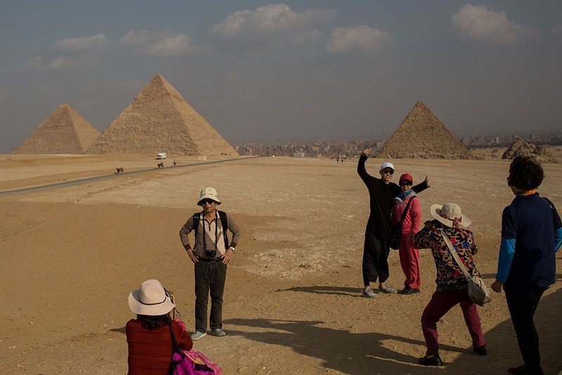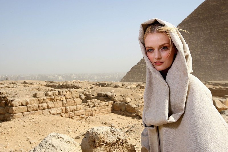Seorang model berpose di depan piramida. Bagaimanapu, Piramida ini adalah usaha luar biasa dan koordinasi besar-besaran para manusia di Mesir kuno. Foto: Getty Images