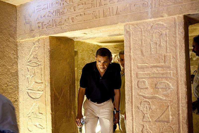 Presiden Obama ketika mengunjungi Piramida Giza. Para arkeolog meyakini ada ribuan pekerja terlatih yang menggunakan perahu untuk menyusuri kanal yang digali sepanjang Sungai Nil. Pelayaran ini bertujuan mengangkut batu kapur. Perahu-perahu ini disatukan oleh tali tebal yang dipilin. Beberapa di antaranya masih dalam kondisi baik saat ditemukan. Foto: Getty Images