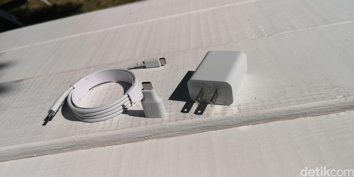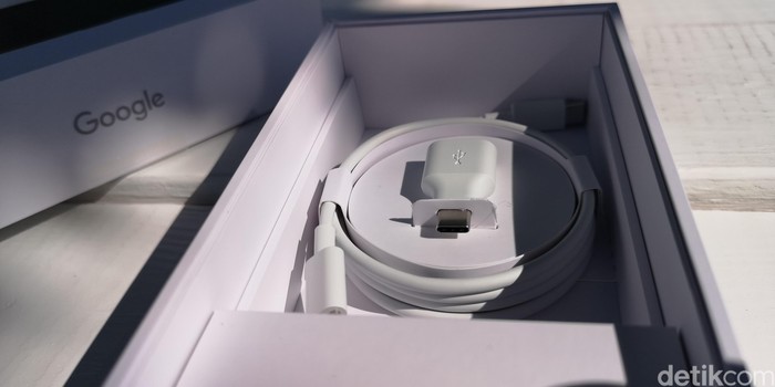 Di dalamnya lagi terdapat kabel kabel type C, dongle untuk USB, dan adaptor. Tidak ada earphone untuk penjualan Pixel anyar ini. Dan, ada sticker logo Google dengan hashtag #teampixel yang menjadi tagline kampanye dari ponsel ini. Foto: Agus Tri Haryanto/detikINET