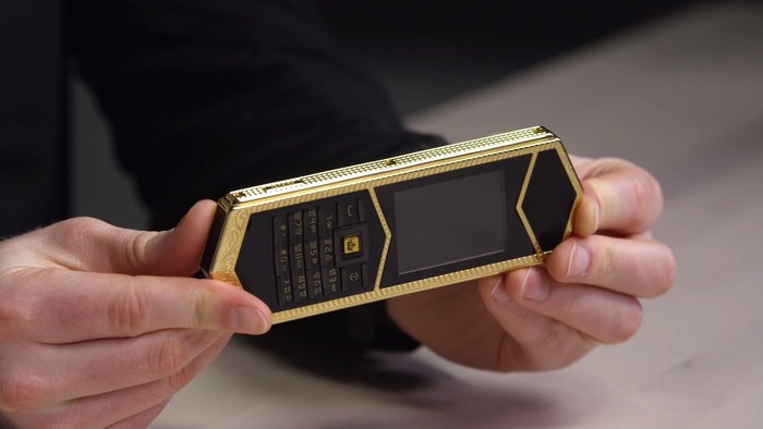 Ia merupakan feature phone namun dengan tambahan ornamen-ornamen yang terbuat dari emas. Foto: Screenshot YouTube/UnboxTherapy