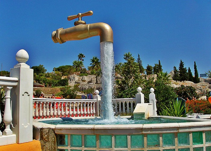 Tap Fountain, Spanyol. Konsel air mancur ini mungkin yang terbaik dan menakjubkan. Terletak di Menorca, Spanyol, air mancur berbentuk keran air raksasa ini terlihat seperti menggantung di udara. Triknya, penopang keran raksasa tersebut ternyata disembunyikan di balik aliran air yang keluar dari air mancur. Keren! Foto: via Brainberries