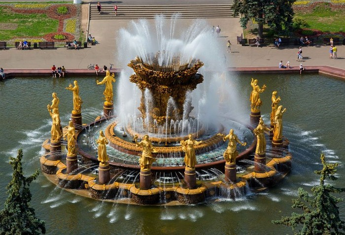Friendship of the Peoples Fountain, Moskow, Rusia. Dibangun pada era pemerintahan Soviet, air mancur besar ini mewakili semua budaya dan kebangsaan bekas Uni Soviet. Arsitek K.G. Topuradze dan G. Konstantinovskiy mendesainnya dengan 16 patung emas gadis cantik yang mengenakan kostum nasional dari berbagai Republik Uni Soviet.Β Foto: via Brainberries