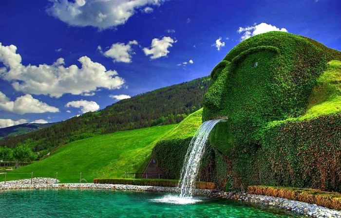 Swarovski Fountain, Watten, Austria. Pergilah ke Watten, Austria untuk menikmati tontonan yang luar biasa ini. Air mancur Swarovski terletak di taman Crystal World yang dibangun oleh perusahaan Swarovski. Tak heran, nama ini disematkan pada air mancur tersebut. Air mancur Swarovski berbentuk kepala raksasa yang menjadi bagian dari bukit, kemudian air mengalir keluar dari mulut raksasa itu. Foto: via Brainberries