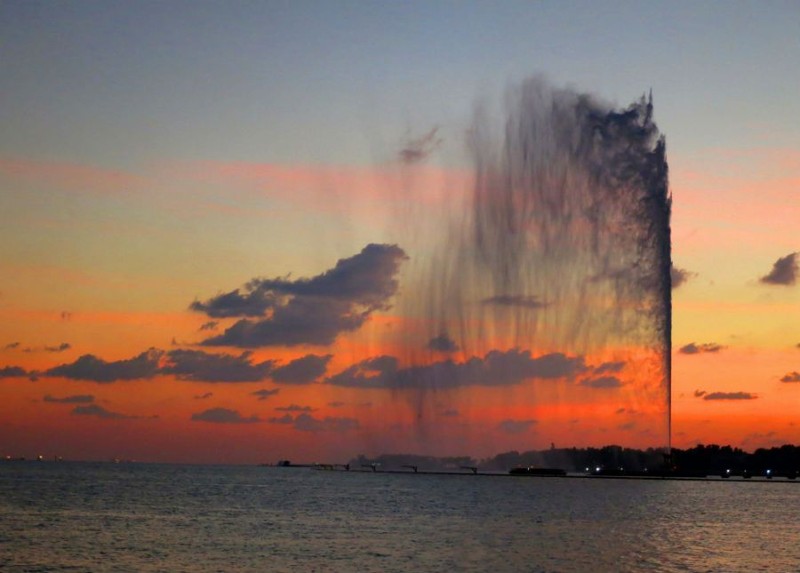 King Fahd’s Fountain, Jeddah, Arab Saudi. Pantai Laut Merah di Jeddah menyuguhkan atraksi air mancur tertinggi di dunia. Raja Fahd mempersembahkan air mancur ini untuk penduduk Jeddah. Desain air mancur dibuat ramah lingkungan karena airnya diambil dan dikembalikan ke Laut Merah. Foto: via Brainberries