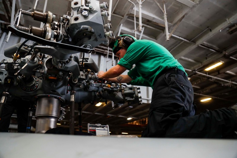 Tampak mekanik sedang memasang komponen di helikopter MH-60R Sea Hawk. Foto: Reuters