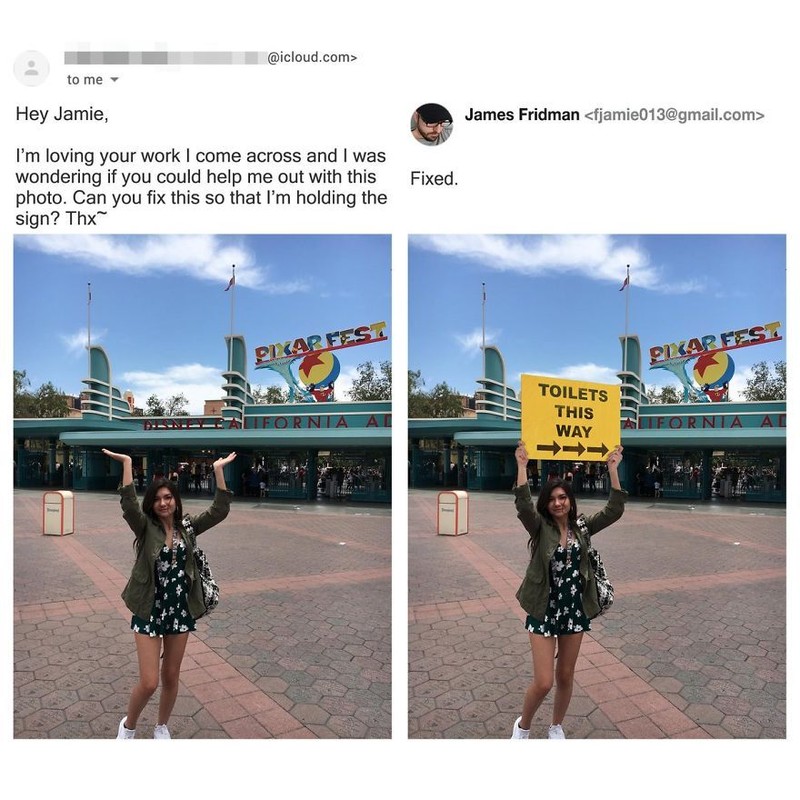 Minta diedit agar tangannya memegang papan penanda. Foto: James Fridman