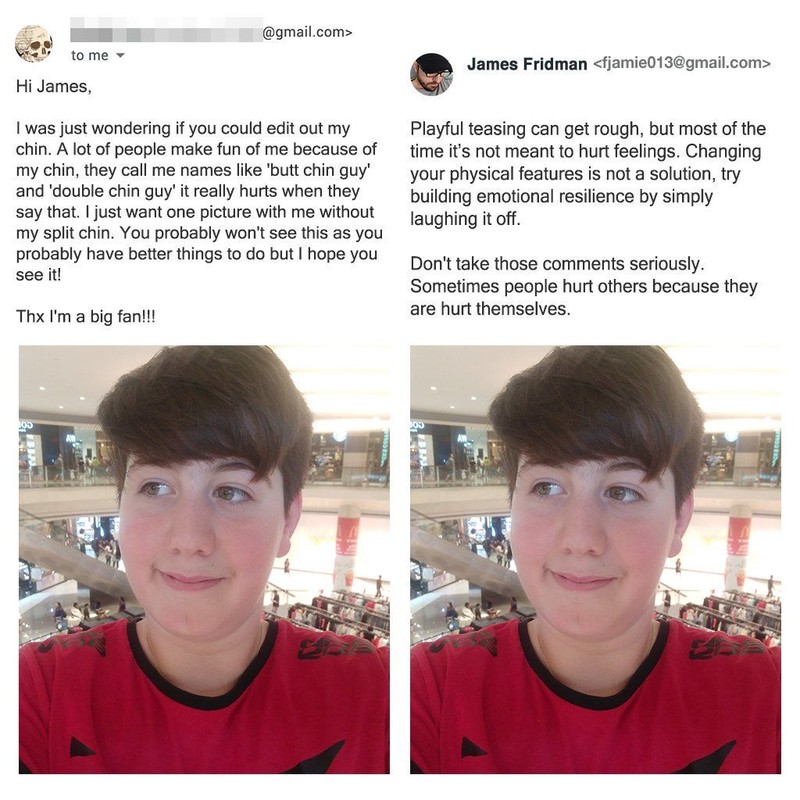 Si Cowok minta dieditkan lengan dan doublechin sang pacar. Foto: James Fridman